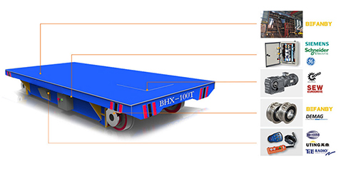 BHX:采用滑觸線將380V交流電源引入平車作為該平車的電力來源,其運行頻率和使用時間不受束縛,適用于較長距離運輸的場合。滑觸線安裝平車底部或兩側,會對其他車輛的過往造成影響,但因其臺面較低,卻是流水線生產的 輸送設備。
